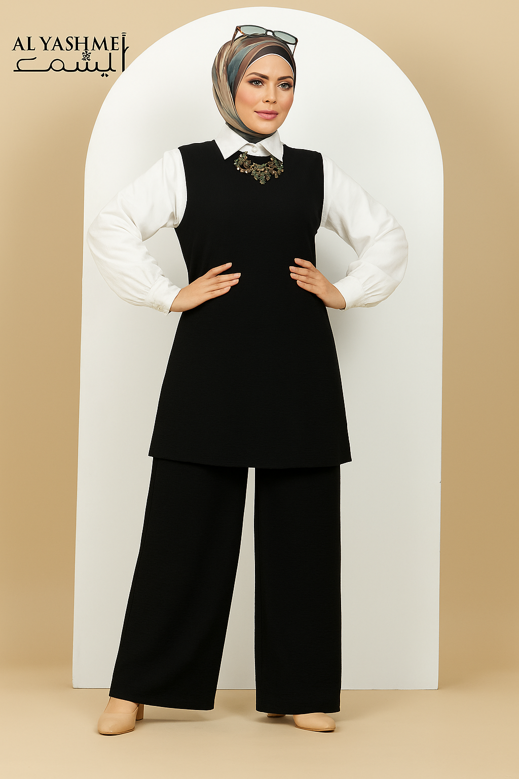 The Basic Suit is a versatile modest outfit, designed for women who value both style and practicality. Made of soft Jessica crepe fabric, this set features a long tunic and wide-leg pants – perfect for daily wear, work, or casual outings.